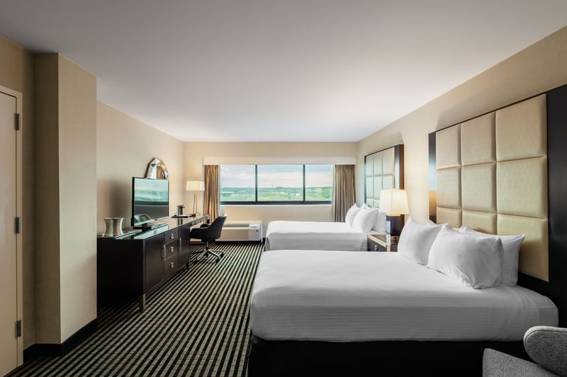 Modernly designed spacious guest rooms (364 sq. ft.) offer two Queen beds with comfortable furnishings and smart washlets. After a long day, unwind in front of your 50-inch HDTV with a wide range of channels, or make use of complimentary high-speed Wi-Fi access to keep you connected.